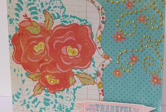 Materiel : un pochoir Prima Marketing avec de l'encre Colorbox , un tampon Maya Road avec de la craie rose Prima et de l'encre turquoise Colorbox, des papiers Recollections (marques des magasins Michaels aux USA), and et du Liquid Pearls dore ! Les fleurs ont ete redecoupees dans les papiers.