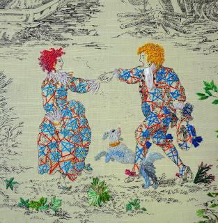 Il brode sur tissu imprimé, comme bon lui semble, selon l’inspiration du moment. Quel fou ce Richard !!!!
