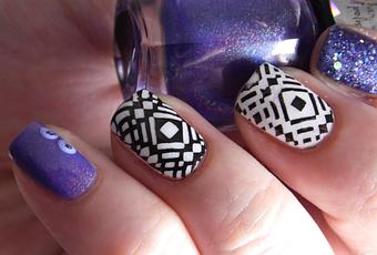 La miss est fan de vernis violet. C'était la bonne occasion pour sortir Purple Rain de LaqueredUp. C'est un vernis violet franc avec un joli holo très présent au soleil. Il a un effet assez bizarre. Les premiers points au dotting tool que j'ai fait dessus étaient au vernis blanc. Vernis qui est devenu parme. Je n'ai pas compris. J'ai ensuite utilisé une de mes nouvelles plaque de stamping de chez MoYou de la collection Pro. Sur cette plaque certains motifs sont en négatif et je trouve l'idée vraiment sympa, ça reste le même stamping mais en différent. Et sur l'index, j'ai posé les paillettes Westminster Bridge Road de Nail Inc.