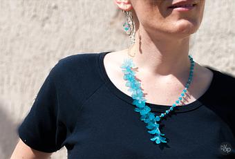 J’ai opté pour des grosses fleurs turquoises : les fleurs sont « piquées » sur une chaine avec des tiges boules sur un coté du collier.