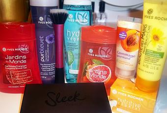 - Eau démaquillante visage et yeux, Yves Rocher- Tonique Hydra Vegetal, Yves Rocher- Gommage gourmand, Yves Rocher- Crème nutritive confort, Yves Rocher- Crème hydratante mains, Yves Rocher- Lot Gels douche pamplemousse / grenade, Yves Rocher- Pinceau finition, Real Techniques- Palette I-Divine Au Naturel, Sleek