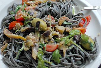 The Ingredients (for 2)- 250g tagliatelle (the black ones made with squid ink) - 1 or 2 pickled smoked marinated herring - 1 eggplant - a handful of arugula - some cherry tomatoes - green olives - 1 clove of garlic - olive oil, balsamic vinegar