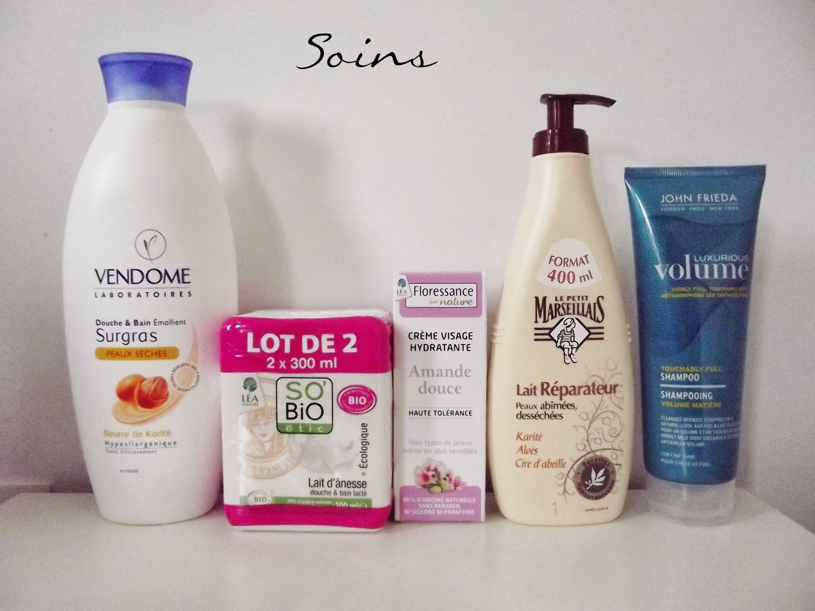 Commençons par les soins! Etant allé le dernier jour des promo chez Leclerc, il n'y avait plus rien d’intéressant en ce qui concerne le make up. Par contre, j'ai déniché quelques produits soins, notamment le Gel Douche & Bain Surgras au beurre de karité de Vendome etun lot de 2 gel douche So Bio Etic au lait d'ânesse que je voulais tester depuis un petit bout de temps. Il me fallait une crème de jour, je me suis tourné vers celle ci, la crème à l'amande douce de Floressance (qui est d'ailleurs géniale, je vous en parlerai bientôt). J'ai ensuite craqué pour le Lait réparateur au Karité, Aloés et Cire d'abeille du Petit Marseillais et enfin un shampoing volume de John Frieda.