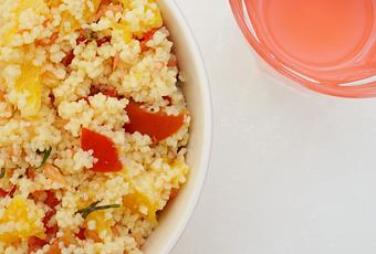 1. Versez la semoule à couscous dans un saladier, ajoutez le jus des 2 citrons avec un peu de pulpe, les 6 cuillères à soupe d’huile d’olive, sel et poivre. Laissez reposer 20 minutes puis mélangez bien les grains avec une fourchette.