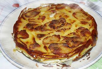 Epluchez les pommes de terre et détaillez-les en fines lamelles. Répartissez-en un quart dans le moule et nappez de préparation à la crème. Parsemez de beaufort râpé. Renouvelez les couches. Répartissez des noisettes de beurre, enfournez et faites cuire 1h. Piquez pour verifier la cuisson.