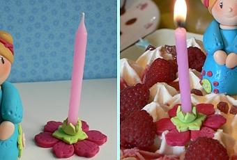 Voici un personnage que j'ai créé pour décorer un gâteau d'anniversaire, et vu les difficultés que l'on a parfois pour faire tenir les bougies j'ai également créé un porte bougie, j'ai essayé il marche même sur de la chantilly ^^