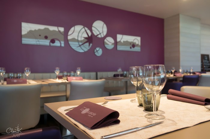 En jouant un jeu de positif/négatif coloré, chaque œuvre prend sa place et ajoute une note tonique à cette atmosphère chaleureuse et élégante.Je suis très satisfaite du résultat, la salle du restaurant est maintenant très équilibrée.