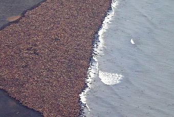 Photographie de l’agence américaine océanographique et atmosphérique (NOAA), montrant quelque 35.000 morses échoués sur une plage dans le nord-ouest de l’Alaska, le 27 septembre 2014. AFP PHOTO / NOAA/COREY ACCARDO – AFP (source)