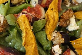 - Laver le Raisin, couper les grains en deux, les poser sur la Salade. Laver les Figues, les couper en lamelles, les ajouter également. Casser les Noix et récupérer les Cerneaux. Les ajouter également à la Salade.