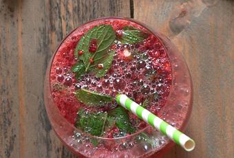 pour 1 verre de cocktail : 15 framboises fraîches 1 cuil à soupe de sucre de canne 1/2 citron vert 6 à 8 feuilles de menthe eau gazeuse