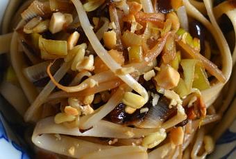 - Faire chauffer un peu d'huile d'olive dans un wok. Y faire revenir l'oignon et le poireau à feu moyen pendant 10 minutes. Remuer de temps en temps. Ajouter ensuite les pousses de soja, la sauce soja et les cacahuètes préalablement concassées et laisser cuire 5 minutes supplémentaires. Poivrer à convenance.