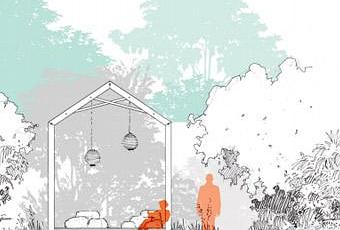 - Le jardin à vivre est au premier abord un sujet d’interrogation, une architecture monolithique noire, contrastant avec la végétation environnante. L’émergence d’une frondaison, ainsi que quelques rares fenêtres suscitent le désir et la curiosité.