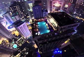 Le base jumper John Van Horne a réalisé un saut nocturne depuis la Menara KL, une tour de 335 mètres de hauteur de Kuala Lumpur (Malaisie), avant d’atterrir dans une piscine située sur le toit d’un autre immeuble.