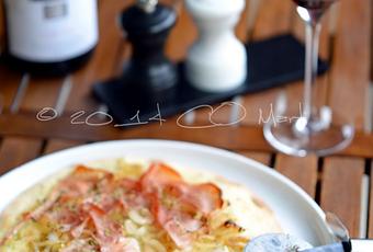 J’ai choisi de faire une sorte de tarte flambée à ma façon : Une base de pâte à pizza, garniture presque traditionnelle avec de la crème fraîche, des oignons, mais avec des tranches de jambon cru des Grisons.