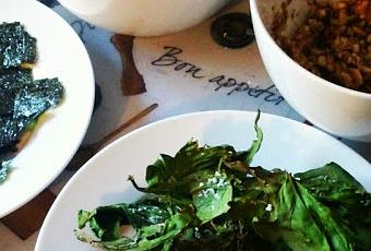 Mes algues nori je les assaisonne avec un peu de fleur de sel et je les sers tel quel! Hier soir j'ai fait des chips d'épinard, dans le four à 250 pendant 1 heure, accompagné de croûtons maisons pour servir la délicieuse tapenades de champignons que j'ai fait moi-même!