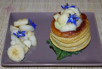 Ingrédients pour deux personnes: 2 bouchées à la reine - 1 poire - 1 pomme - 1 banane