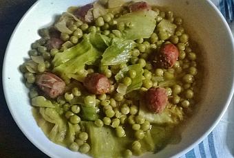 Dans une grand poêle sur feu moyen faites cuire les merguez et les oignons, quand les oignons son translucide ajouter le bouillon de légume porter à ébulition ensuite rajouté les petits pois attendre 5 minutes environ et mettre les feuille de laitue couvrir 2 minutes pour cuire la salade et servir chaud