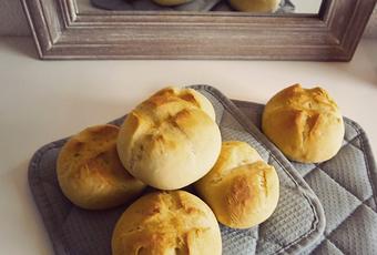 Au bout d'une heure, retravaillez un peu la pâte et confectionnez des petites boules, que vous disposerez sur une plaque de four, préalablement recouverte de papier sulfurisé ( pour éviter que ça colle). Réalisez des petites encoches au couteau.Laissez reposer 30 à 45 min, sous un torchon humide.Préchauffez le four à 200°C, puis enfournez une quinzaine de minutes, jusqu'à ce que nos petits pains aient doré.