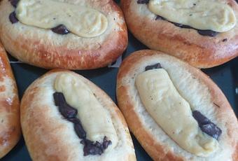 J'ai trouvé cette gourmandise chez la boîte à sucre. Des pains au lait bien moelleux garnis de crème pâtissière et de chocolat. Cette recette nécessite un repos d'une nuit. J'ai trouvé pile le bon dosage de chocolat et de crème pâtissière. J'ai fait mes pains en lait un peu plus gros (85g au lieux de 80) pour obtenir 12 pains au lait bien gourmand.