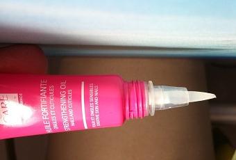 L'huile fortifiante se compose en fait de 3 huiles végétales ( ricin, abricot et macadamia) et se présente sous forme de petit tube avec un applicateur en forme de pinceau asssez rigide. La notice indique qu'on peut l'appliquer sur l'ongles et sur les cuticules. L'application est précise et facile. L'huile n'est pas grasse ( je sais, c'est bizarre) et il n'y a aucune sensation d'inconfort après application, d'ailleurs elle sèche relativement vite. Ce qui est assez bluffant c'est qu'immédiatement après l'application je trouve mes ongles plus durs. Ils sont aussi plus brillants et plus lisses, comme réparé de l'intérieur.