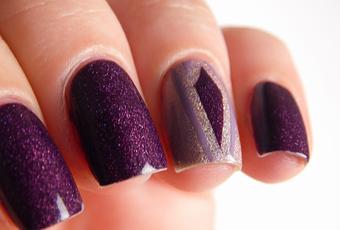 Pour garder cette douceur veloutée, en accent nail j'ai posé deux couches d'un rose pâle holographique de chez Catrice (dont le nom m'échappe). Quelques morceaux de nailvinyls (ou striping tape pour les plus courageuses), un violet crème (peu importe) et un rappel de Widow's walk et c'est tout! C'est archi rapide!