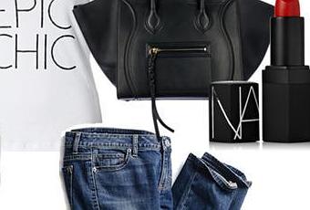 Tshirt Epic Chic – Jeans Victoria’s Secret – Chaussures Giuseppe Zanotti - Sac Céline Phantom – Bonnet laine – Lunettes geek Oliver Peoples – Casque Beats – Coque Iphone 5 - Collier noeud pap’ – Boucles d’oreilles Alexandra Moosally – Bracelet – Vernis Butter London – Rouge à lèvres NARS