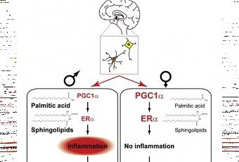 Les chercheurs du Cedars-Sinai Medical Center (Los Angeles) montrent chez des souris nourries avec un régime riche en graisses une inflammation dans le cerveau des souris mâles et des dommages cardiaques associés, alors que les souris femelles semblent mieux supporter ce régime. L’équipe montre, que chez les mâles, un régime riche en graisses réduit les niveaux d’une protéine, PGC-1α, -déjà connue pour son implication dans le métabolisme- qui régule les niveaux des récepteurs des œstrogènes dans les neurones et les astrocytes de l’hypothalamus. La baisse des niveaux de cette protéine favorise l’inflammation. Ainsi, cette inflammation de l’hypothalamus chez les mâles est corrélée à une réduction de la fonction myocardique. Enfin, ces modifications cérébrales peuvent se développer chez les mâles très rapidement, sur une très courte période d’apports aliments gras et sucrés.