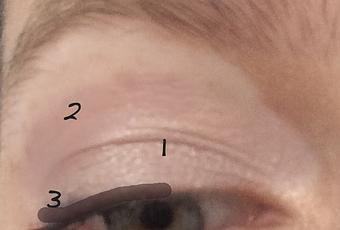 Je propose l'application d'un fard clair couleur chair plus ou moins irisé (1) sur l'ensemble de la paupière. Puis, on dessine avec un maronné taupe mat (2) dans le creux de l'oeil pour donner de la définition. Et je prends une couleur foncée (3) que j'applique en ras de cils supérieurs et au tiers extérieur du ras de cils inférieurs. Et bien sûr du mascara .