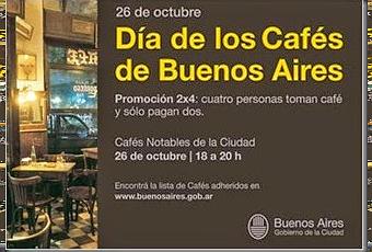 Ce dimanche 26 octobre 2014, de 18h à 22h, un certain nombre de Bares Notables de la Ville de Buenos Aires participeront à l'opération culturo-promotionnelle du Día de los Cafés Notables, au cours de laquelle traditionnellement, si vous êtes quatre, vous pouvez prendre quatre cafés pour le prix de deux dans les établissements participants.