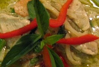 Mettre tous les ingrédients pour réaliser la pâte de curry vert dans un mixer et moudre finement ou écraser au mortier. Verser une partie du lait de coco et la pâte de curry vert dans une grande casserole, porter à ébullition et bien mélanger. Ajouter le bœuf ou le poulet, la sauce de poisson et le sucre. Laisser mijoter 5 mn. Ajouter les aubergines et laisser 2 mn à petit feu. Mélanger au lait de coco restant. Ajouter les feuilles de bergamote et de basilic. Verser le tout dans un bol de service et décorer avec les piments rouges.