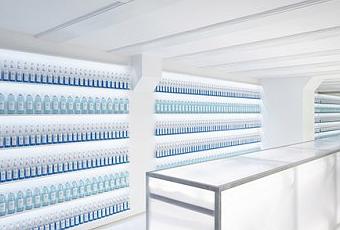Les studios d’architecture XML ont concu un magasin d’eau et de boissons vitaminés en plein coeur d’Amsterdam Le magasin est entièrement blanc . L’élément principal de l’espace est une longue barre translucide de 9 mètres contenant 28 tubes lumineux qui crée un volume incandescente, contraste avec la teinte pourpre qui définit la zone.