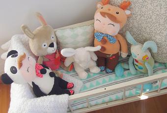 J'ai trouvé un super plaid mint avec des triangles pour quelques euros chez Hema. Hop, quelques coussins et doudous et voilà un petit lit de poupées qui n'attend plus que des petites mains. Je vous montre le reste de la chambre quand elle sera finie ^_^