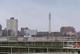 The Moncton skyline as seen from TransAqua, The Greater Moncton Wastewater Commission in Riverview. Le centre-ville de Moncton, tel qu’aperçu par TransAqua, la Commission des eaux usées du Grand Moncton.