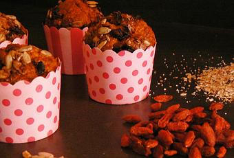Mélanger les ingrédients secs. Dans un autre bol, fouetter les oeufs, puis ajouter l'huile et le lait fermenté. Ecraser la banane. Verser les ingrédients humides et la banane sur les ingrédients secs. Bien mélanger et répartir dans 8 moules à muffins. Déposer sur chaque gâteau quelques baies de Goji, graines de tournesol et graines de lin en les enfonçant un peu avec une fourchette.