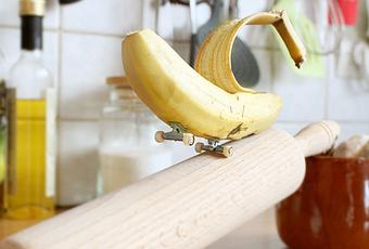 Entre kickflip et nosegrind sur une casserole ou un rouleau à pâtisserie, Benoit Jammes imagine la vie sportive cachée des fruits et légumes dans notre cuisine. Pomme de terre, poivron ou banane vont ainsi exécuter différents tricks armés de leurs roues issues de finger skate.