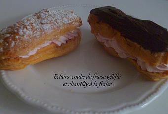 Des éclairs avec un coulis de fraise gélifié surmonté d'une chantilly à la fraise, le tout glacé au chocolat ou plus simple juste saupoudré de sucre glace.Cette chantilly de fraise sortie de mon imagination est juste sublime, j'en referais à coup sur.