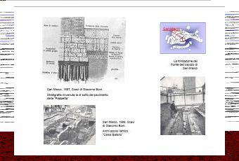 Les deux premières photos montrent les anciens pavement en chevrons de briques (comme on peut en voir dans certaines cortes vénitiennes encore de nos jours) et les fondations de la façade de l’Hospice San Marco qui avait été démoli pour élargir la place.