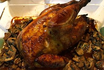 - Découper la Volaille, la placer dans un plat entourée des Champignons et Légumes qui les accompagnent ou de Pommes de terre sautées, comme je l'ai fait moi même ...