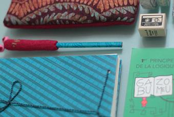 Voici ce que j’ai reçu : un crayon « monstrueux » trop mignon, un tampon cassette audio (j’adore !) et son encre rose-prune, une jolie trousse style ethnique, un carnet à photos fait main !