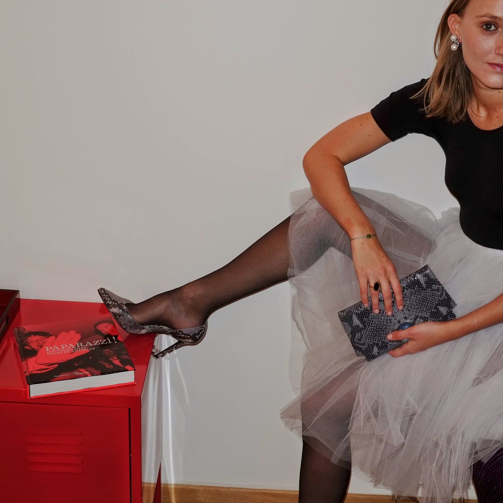 Boucles d'oreilles : Kenneth Jay Lane (sur Net à Porter et Out Net pour ses bons plans !) Body : Wolford Jupon : Repetto Collants : Falke Bagues et pochette : Sestra Paris Escarpins : Zara