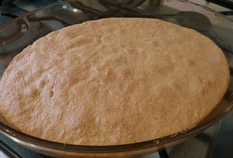 Pour réaliser ma recette, j'ai simplement doublé les proportions et obtenu une base d'environ 3 cm d'épaiseur, qui ressemble à une génoise, cuite dans un plat "sabot" ovale en Pyrex. On pourrait aussi cuire le biscuit sur une feuille de papier sulfurisé sur plaque, avec une épaisseur moindre et sans doute avec un temps de cuisson moins long.