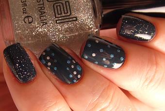 Sur le pouce, l'index et l'annulaire, j'ai passé une couche du top coat Galaxy de Glitter Gal. Il s'agit d'une base transparente avec des particules scatter qui nagent dedans et qui se dissolvent magnifiquement bien! Pour la déco des autres doigts, un dotting tool, Dime Piece d'Enchanted Polish et Blue