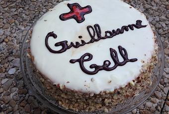 Après l'Alcazar, je me suis essayée au Guillaume Tell. J'ai suivi la recette de Mercotte, j'ai juste divisé par deux les quantités pour faire des disques d'un diamètre de 15 cm et j'ai adapté quelques ingrédients. Le plus dur, selon et pour moi, a été le glacage blanc (pour qu'il soit bien uniforme) et l'écriture au chocolat ( à travailler !!!).