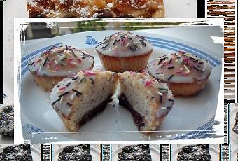 Pendant ce temps, faites fondre le chocolat blanc avec la crème fraîche et laissez refroidir ou mettez au frigo, puis nappez le dessus des petits gâteaux et décorez de vermicelle