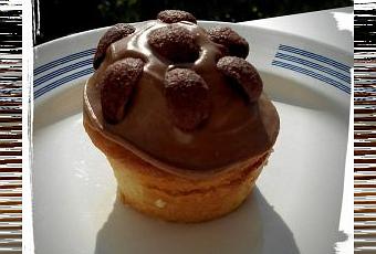 Tartinez le dessus des mufins de pâte à tartiné chocolat-noix de coco et décorez avec les corn-flakes au chocolat