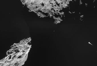 Portrait composite de la comète 67P/C-G capturé par la NavCam de Rosetta, le 30 octobre 2014 à 26,8 km du centre du noyau – le site Agilkia (anciennement « J ») est situé au sommet du plus petit des deux lobes de la comète de 4 km de long