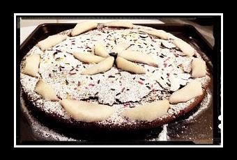Démoulez, laissez tièdir, saupoudrez de sucre glace et décorez de lamelle de poire et vermicelle
