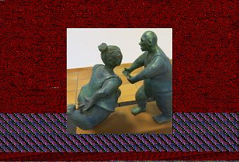 Mais encore… des sculptures de personnages filiformes à la Giacometti (où demeure la trace des doigts du sculpteur, comme si la naissance était en train de se faire…comme si le créateur animait la matière devant nous) et puis, des sculptures lisses de petits personnages rondouillards danseurs ou gymnastes (comme des Bruegel dans ses fêtes au village ) à la patine colorée du plus bel effet…