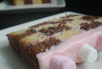 3) Recouvrir le gâteau avec le glaçage restant et déposer des mini-chamallows. Réserver au frais pendant 2 heures minimum ou une nuit avant de découper des tranches.