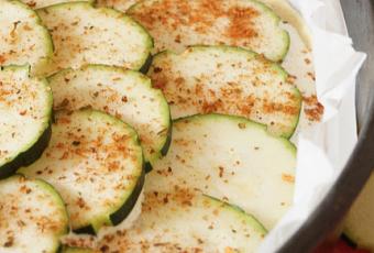 Vérifier que la courgette ne colore pas mais qu’elle soit cuite et que la pâte soit dorée dessous, au besoin poursuivre la cuisson en position « gril dessous ».